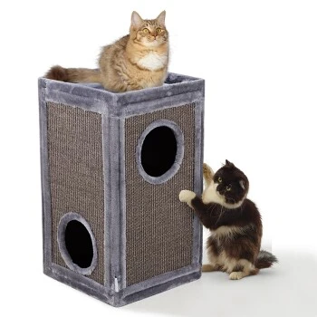 Die robust gefertigte Kratztonne von AniOne lässt sich durch ihr innovatives, dennoch schlichtem Design nahezu problemlos in jede Wohnumgebung integrieren und durch die eckige Form ideal und vor allem dadurch platzsparend in jede Zimmerecke platzieren. Die gesamte Kratztonne ist mit Natursisal umwickelt und animiert Ihre Katze dazu, ihren natürlichen Kratzisntsinkt zu befreideigen, was zugleich Ihre Möbel und Teppiche vor unschönen Kratzspuren schützt. Die beiden Höhlen laden Ihre Katze zum Spielen und ausgiebigen Verweilen ein. Die mit besonders weichem Plüsch-Stoff bezogenen Aussichtsplattform bietet Ihrer Katze einen besonder kuschilgen Platz um ihre Umgebung im Blick zu behalten.