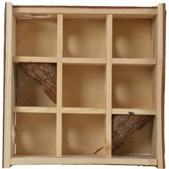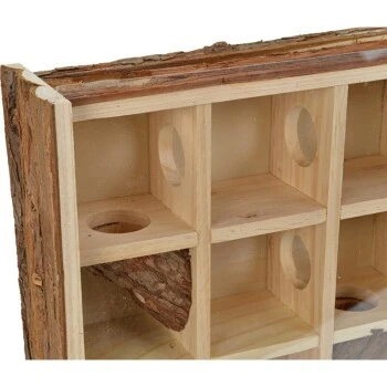Das Naturholz (FSC-Zertifiziertes Holz) und die Beschaffenheit der Original-Baumrinde unterstützen das natürliche Nageverhalten und die notwendige Abnutzung der Zähne.