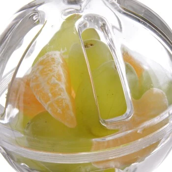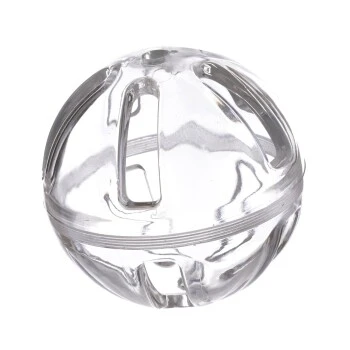 Durchmesser ca 9 cm, zwei stabile Kugelhälften, in denen Futter oder anderes Beschäftigungsmaterial versteckt werden kann.