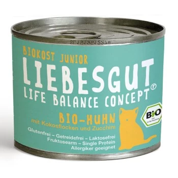 Liebesgut Biokost Junior ist ein glutenfreies Bio-Alleinfutter für Kitten bis zum 12 Lebensmonat aller Rassen und Größen, das den kompletten Nährstoffbedarf des Tieres abdeckt.