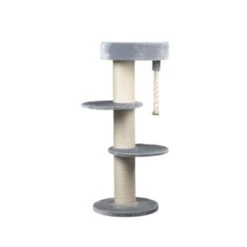 Die Liegefläche von 60Øcm hat eine 16cm hohe Kante die vollständig mit Plüsch bedeckt ist. Das gesteppte Kissen ist herausnehmbar und waschbar. Die Stufen sind auch komplett mit Plüsch bedeckt. Das Spielseil hat eine Länge von 41 cm.