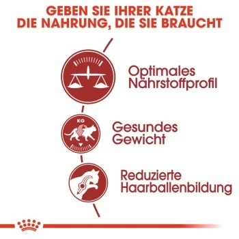 ROYAL CANIN Fit 32 hat einen angepassten Kaloriengehalt, der ausgewachsenen Katzen hilft, ihr Idealgewicht zu halten. Dies trĂ€gt zur Förderung einer optimalen körperlichen Verfassung bei. ROYAL CANIN Fit 32 enthĂ€lt ausgesuchte Ballaststoffe, die helfen, das Ausscheiden geschluckter Haare zu erleichtern. Dies sorgt letztlich auch fĂŒr eine deutlich reduzierte Haarballenbildung.